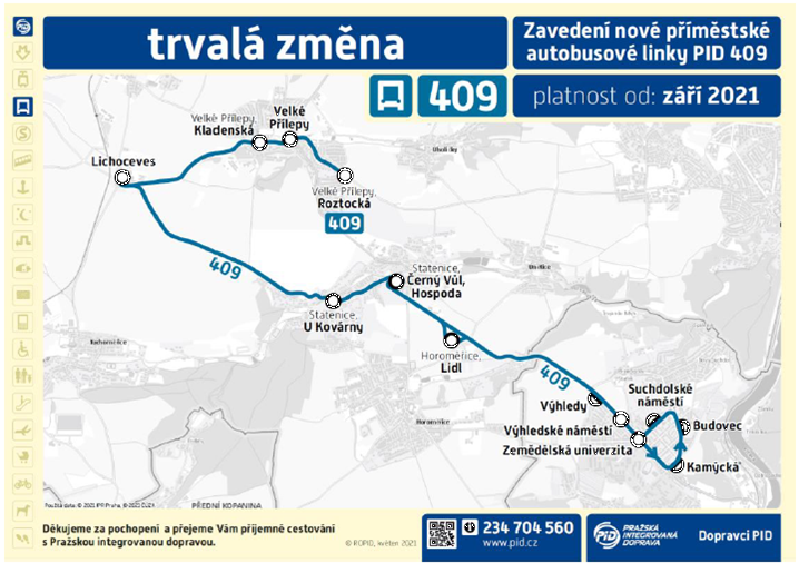 V rámci projektu SMACKER probíhala jednání o zavedení nové autobusové linky mezi Suchdolem a okolními obcemi. V září 2021 byla zprovozněna nová linka 409 se zastávkami na Suchdole, v Horoměřicích u Lidlu, ve Statenicích, Lichocevsi a ve Velkých Přílepech.